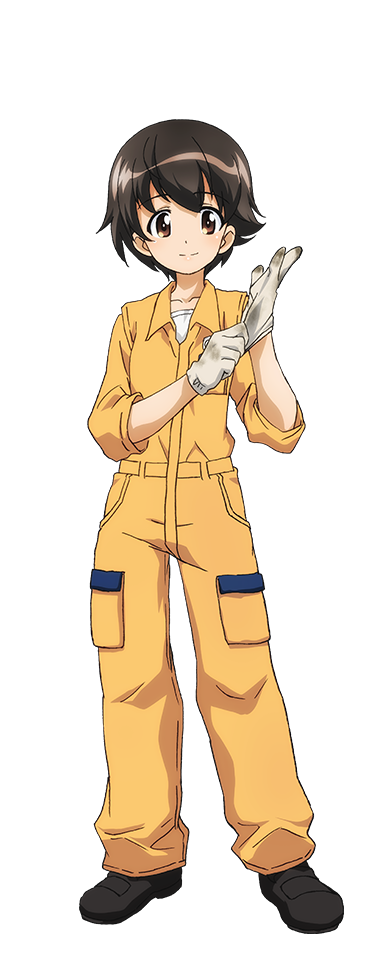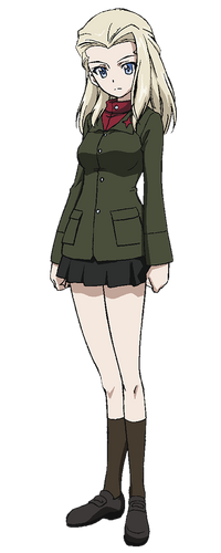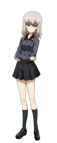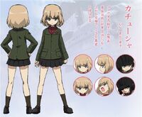 Katyusha(Escuela Pravda): Katyusha (Катюша, Kachūsha) Katyusha una estudiante de Pravda Girls High School y el comandante general del equipo Sensha-do de la escuela, que opera un T-34/85 Soviético.es una chica con el pelo rubio corto y un par de ojos de color azul claro. Ella también lleva un uniforme marrón estilo verde con una cruz roja de Rusia, seguido de una falda del mismo color distintivo, o como en el combate contra Oarai, un mono modelo de los operadores de tanques de Rusia WW2. Katyusha también muestra el uso de gorro acolchado de un tanquista Ruso cuando ella se prepara para la batalla, que se ve demasiao grande en alguien tan pequeña como ella. Ella tiene una estatura muy diminuta, por lo que su edad difícil de determinar. Sin embargo, ella dice que esta en su último año de escuela secundaria, por lo que sólo se puede suponer que es de unos 17 o 18 años de edad.
